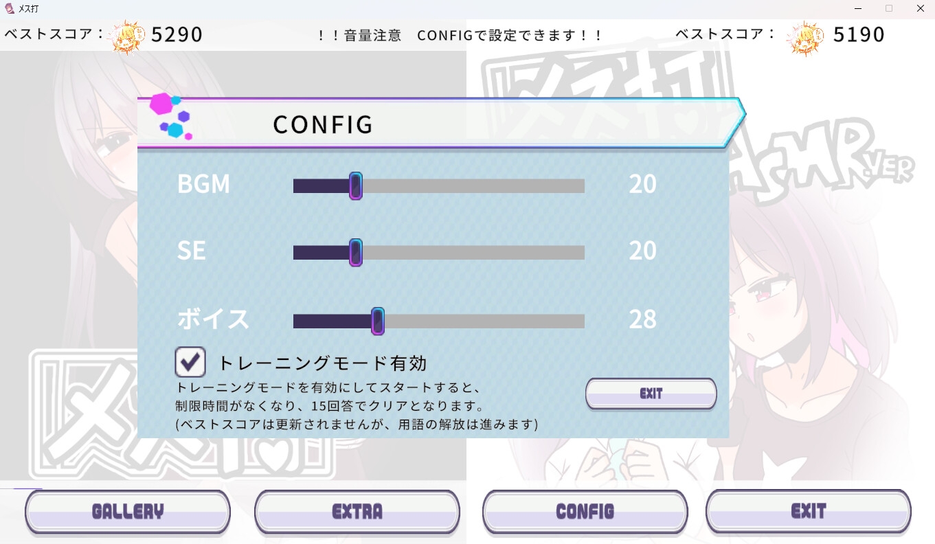 タイトル画面の「CONFIG」から、トレーニングモードを有効にできます。